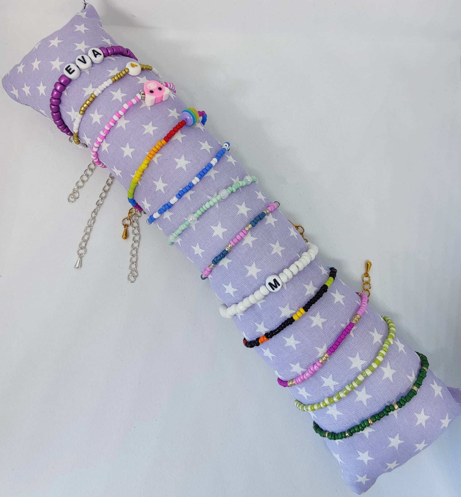 Er zit geen maximum aan het aantal sieraden wat de kinderen mogen maken. Ik zorg ervoor dat ik genoeg kralen in verschillende kleuren en maten meeneem en heel veel hele leuke bedels.