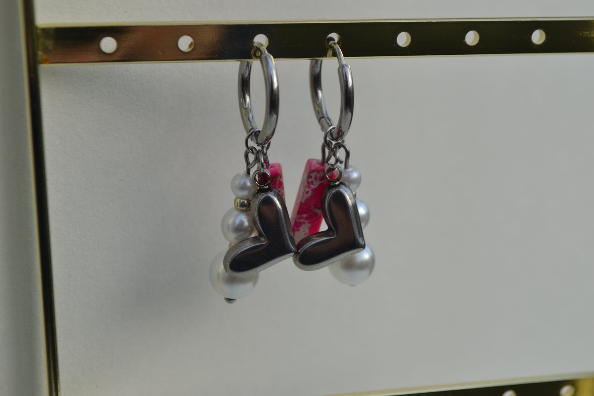 De creolen zijn 16 mm in diameter en alle zilverkleurige onderdelen zijn gemaakt van roestvrij staal. De roze kraal met edelsteen look, de facet kralen en de parelkralen zijn allemaal gemaakt van glas. De zilveren kralen zijn miyuki rocailles.