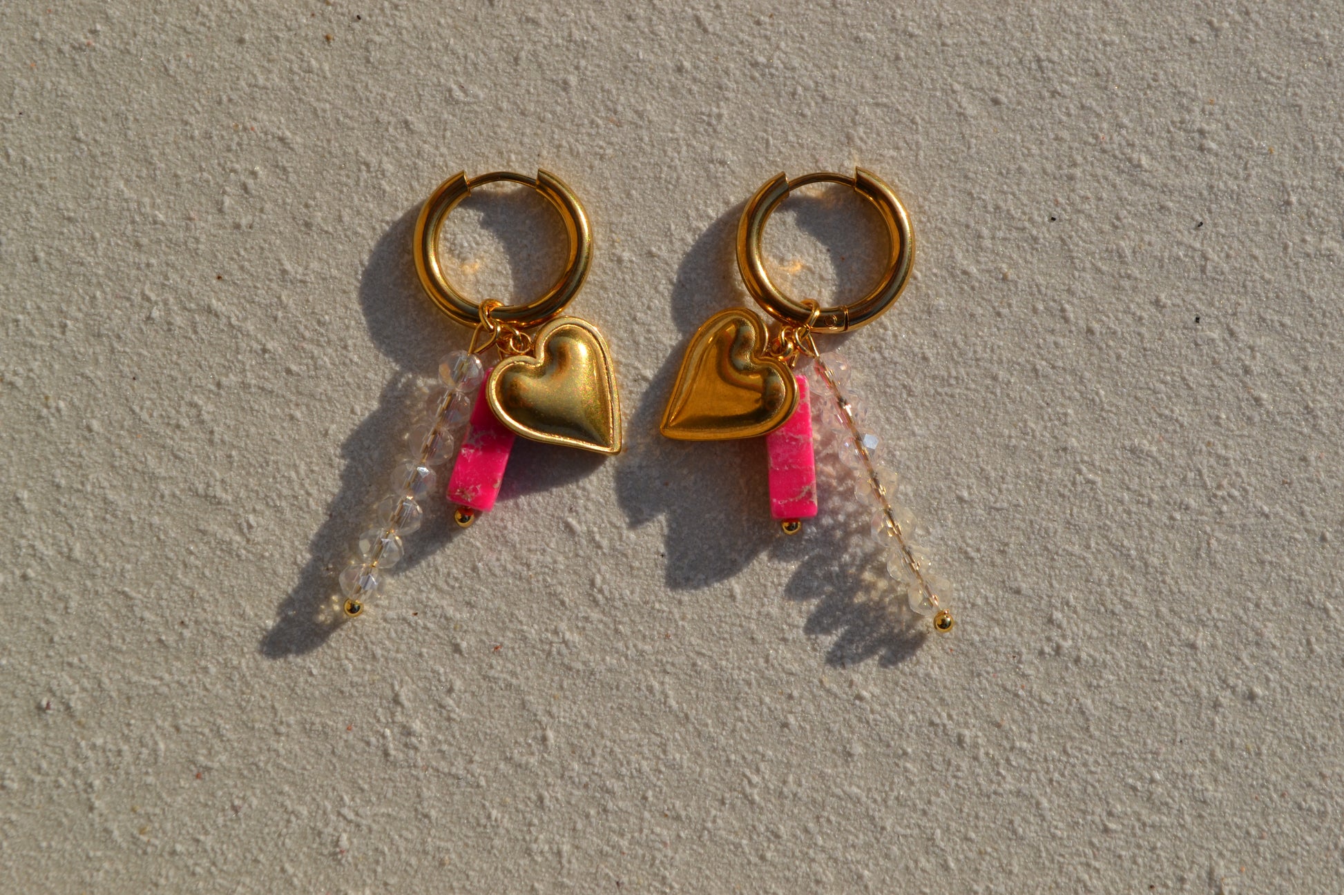 De creolen zijn 16 mm in diameter en alle goudkleurige onderdelen zijn gemaakt van roestvrij staal. De roze kraal met edelsteen look en de facet kralen zijn allemaal gemaakt van glas.
