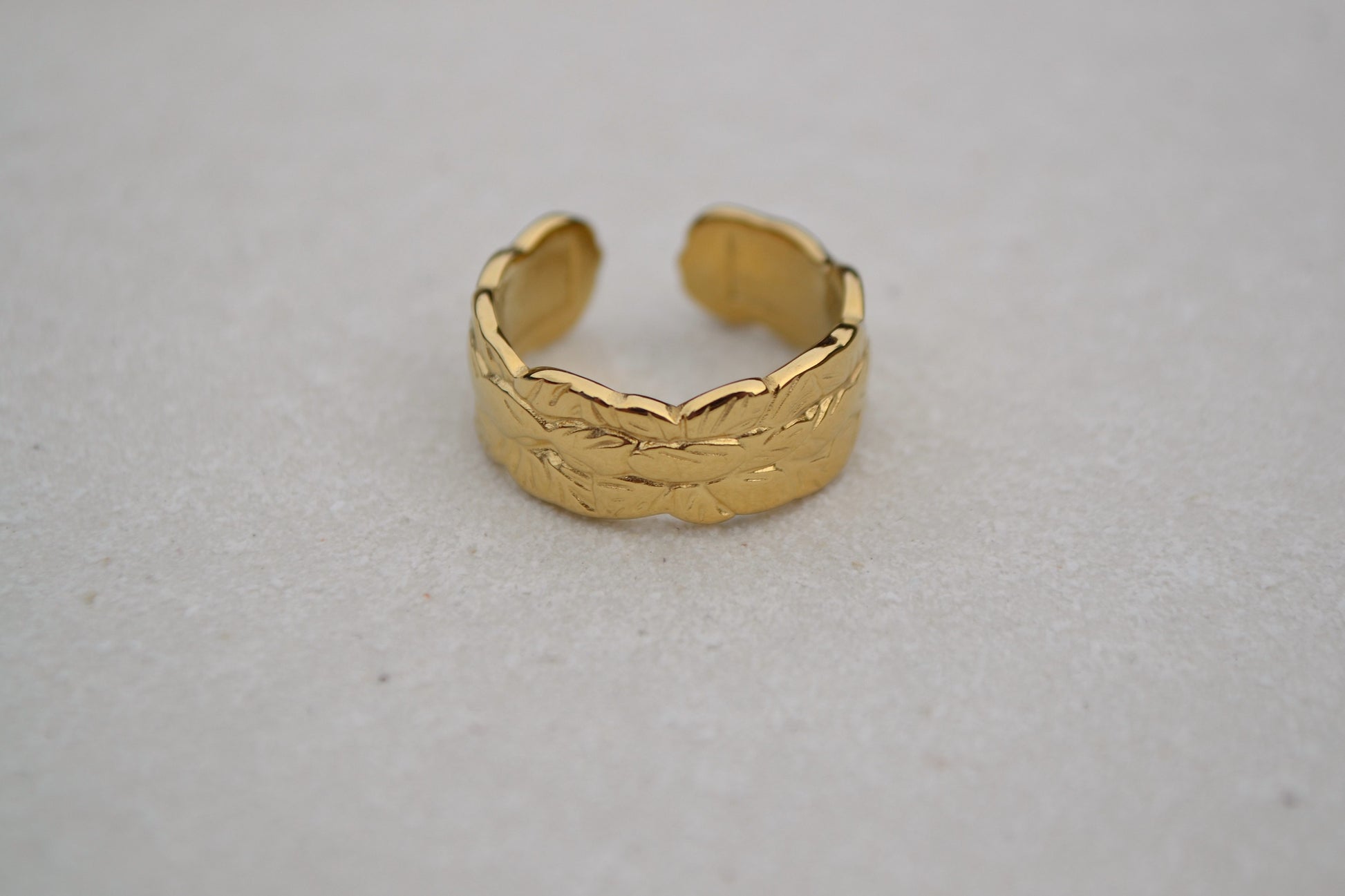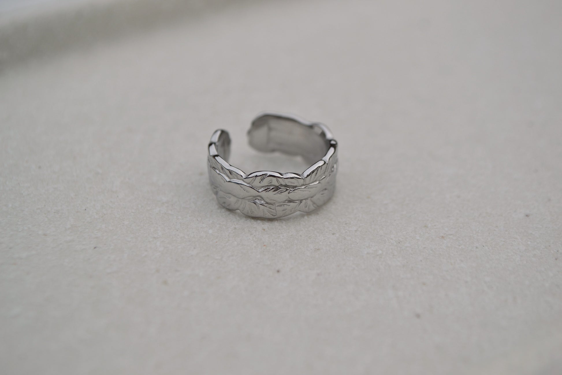 Deze ring met bladmotief is gemaakt van roestvrij staal. De ring is verstelbaar en te dragen vanaf ringmaat 17. Deze ring is perfect als statement piece of om te combineren met andere ringen! De ring is beschikbaar in het zilver en in het goud.