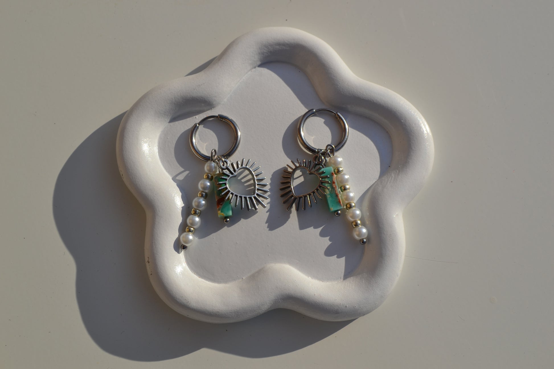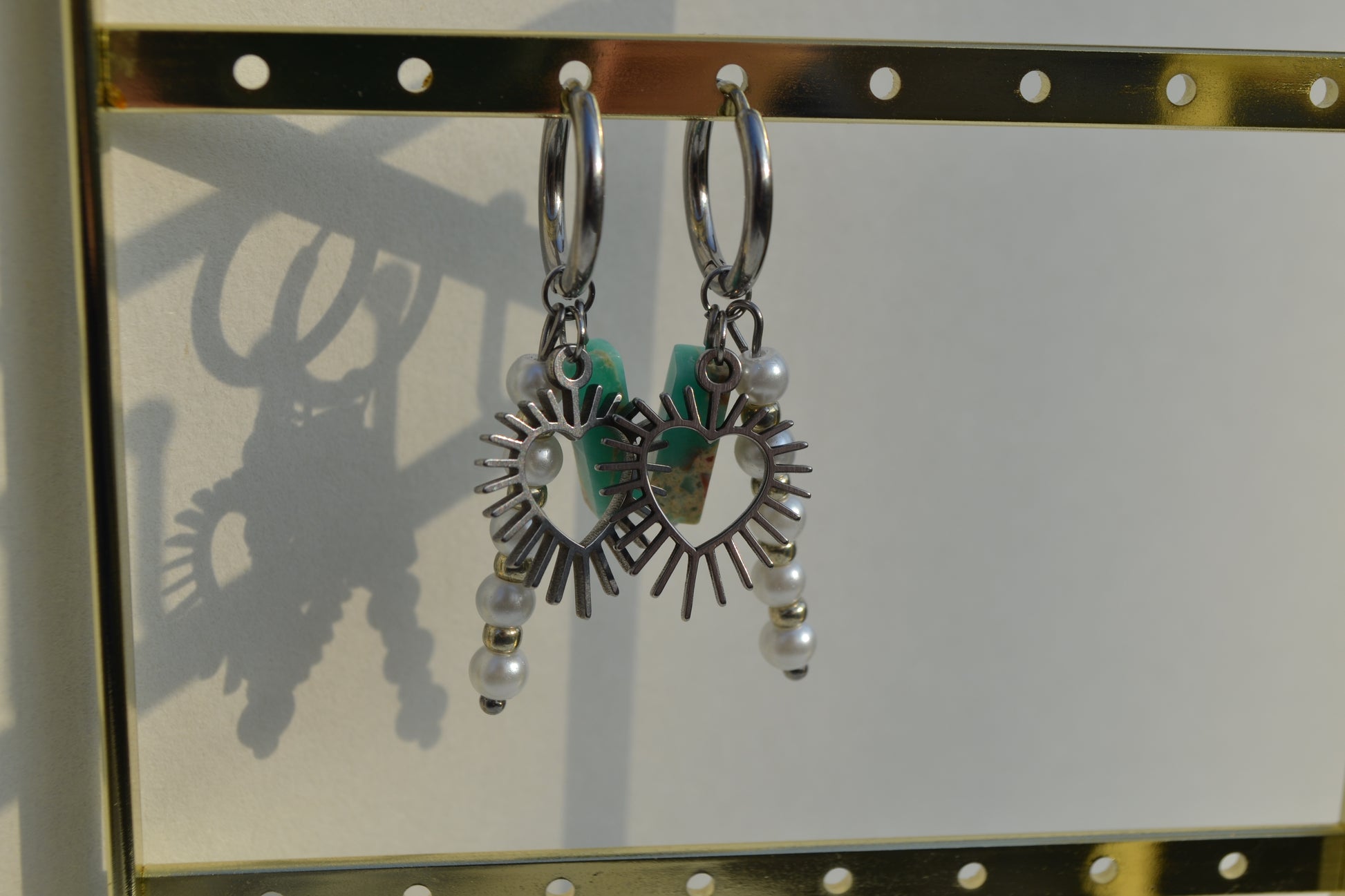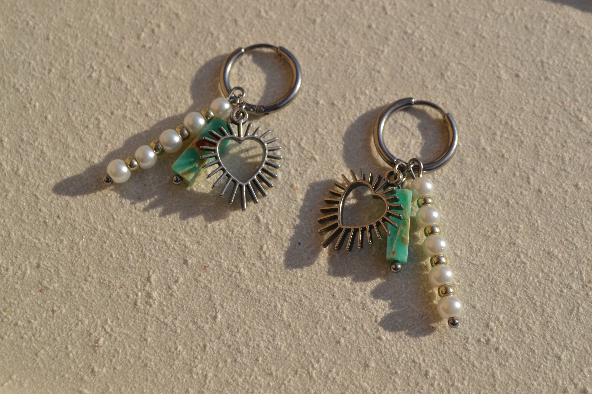 De creolen zijn 16 mm in diameter en alle zilverkleurige onderdelen zijn gemaakt van roestvrij staal. De turqouise kraal met edelsteen look is een glaskraal.