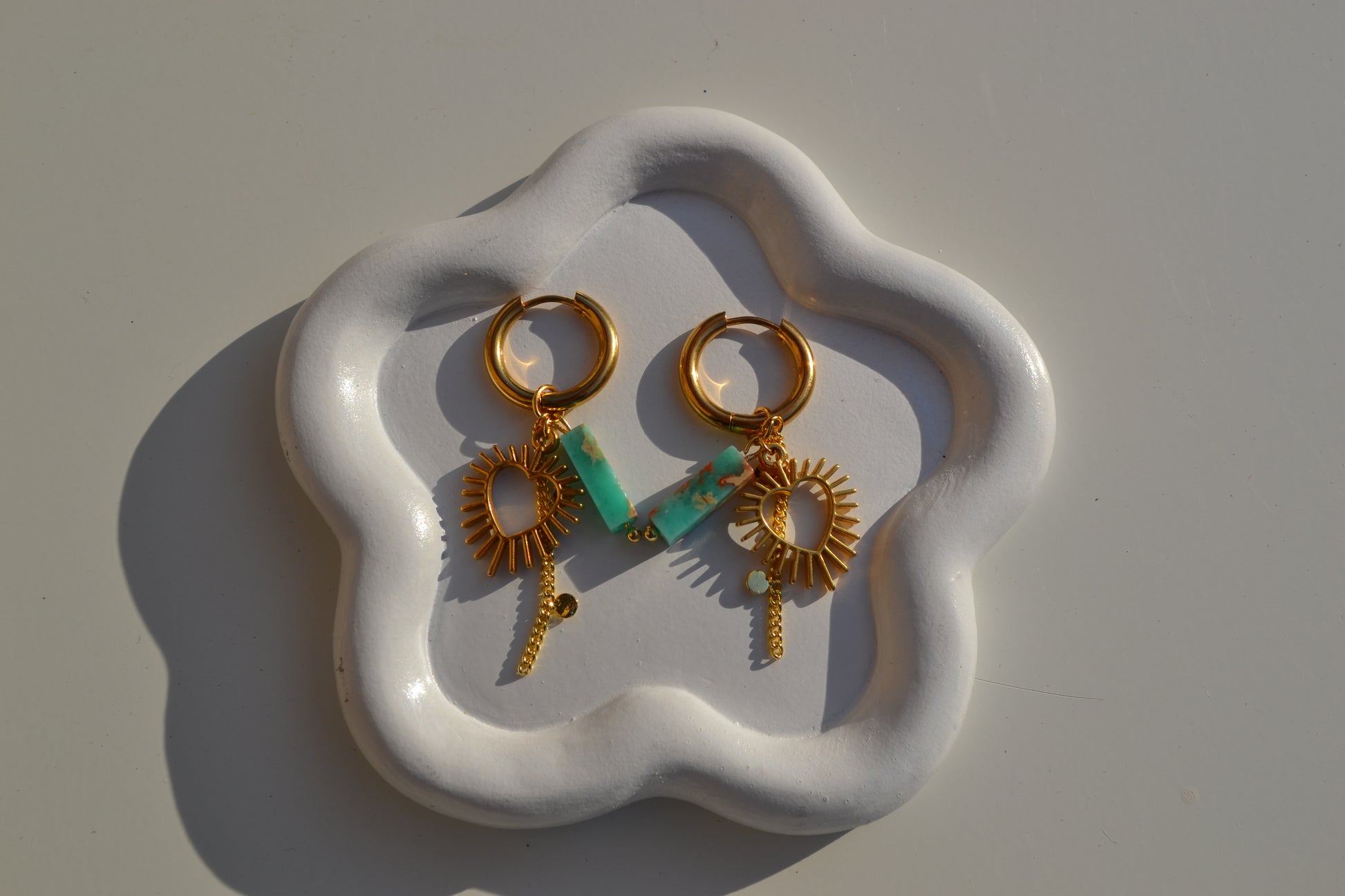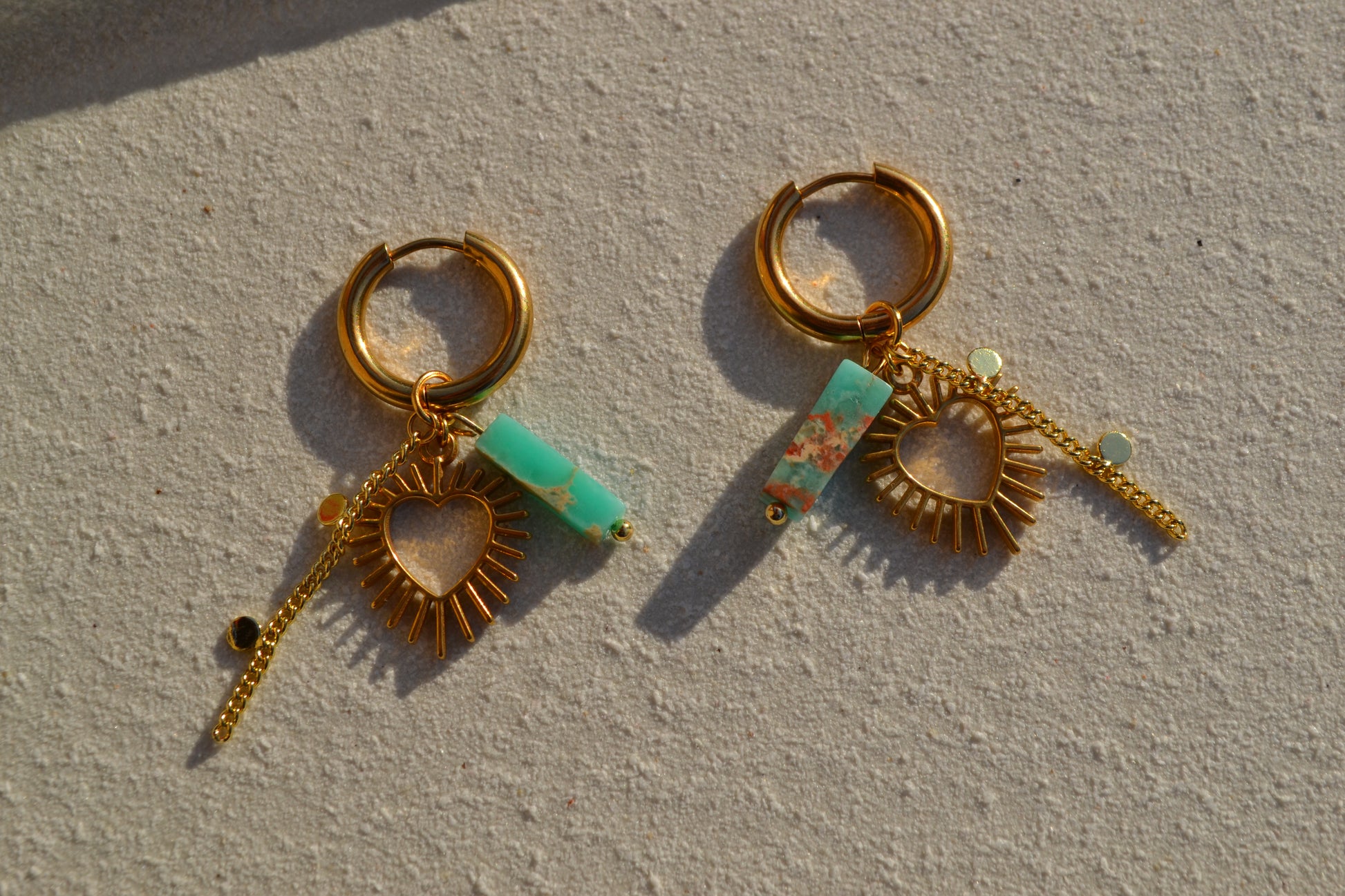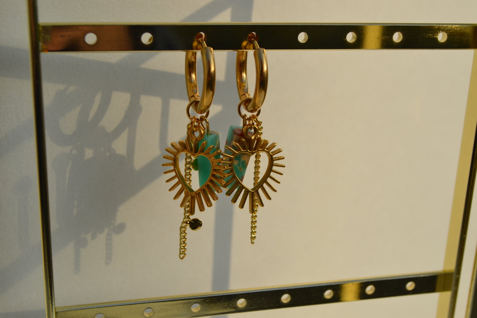 De creolen zijn 16 mm in diameter en alle goudkleurige onderdelen zijn gemaakt van roestvrij staal. De turqouise kraal met edelsteen look is een glaskraal.