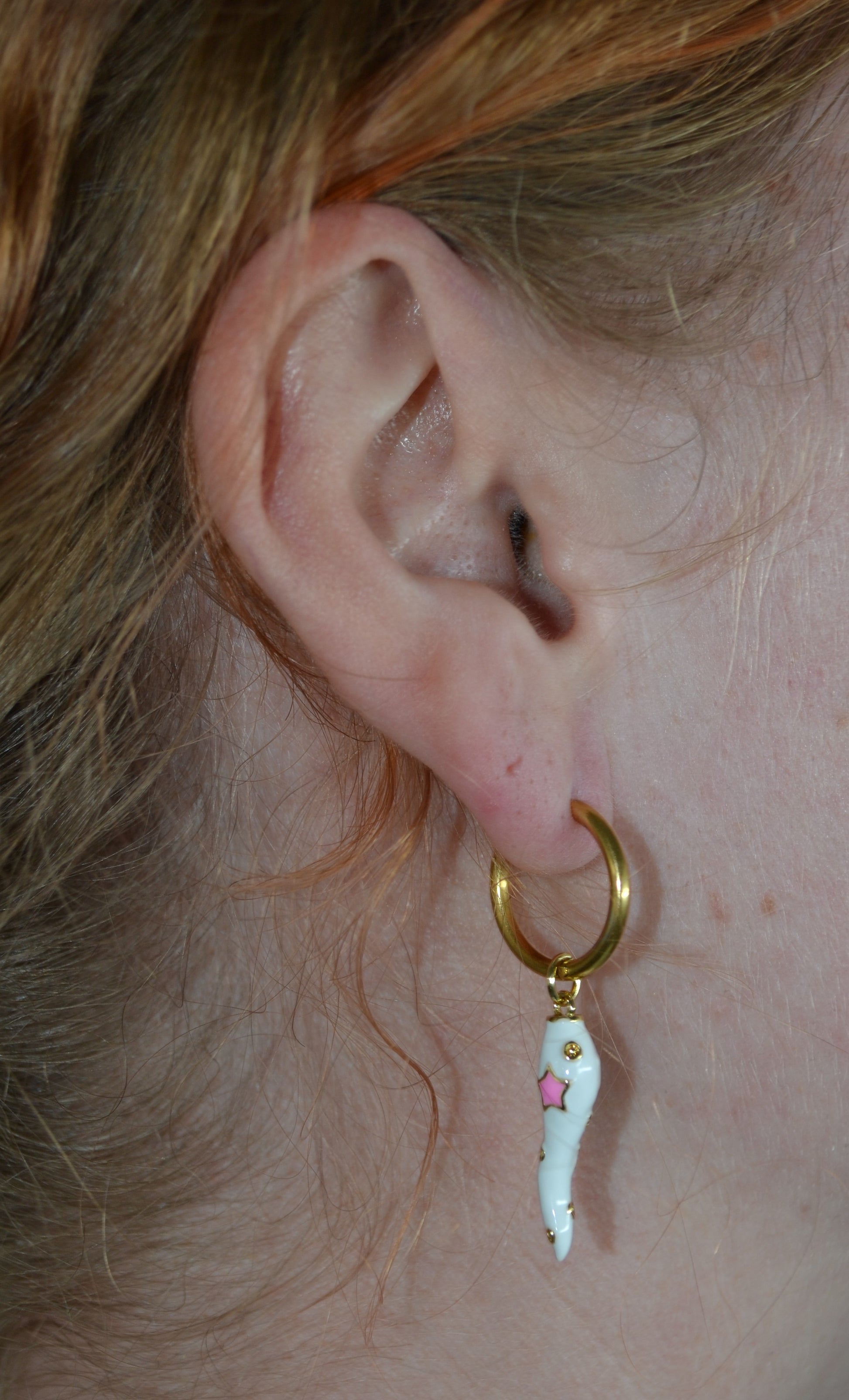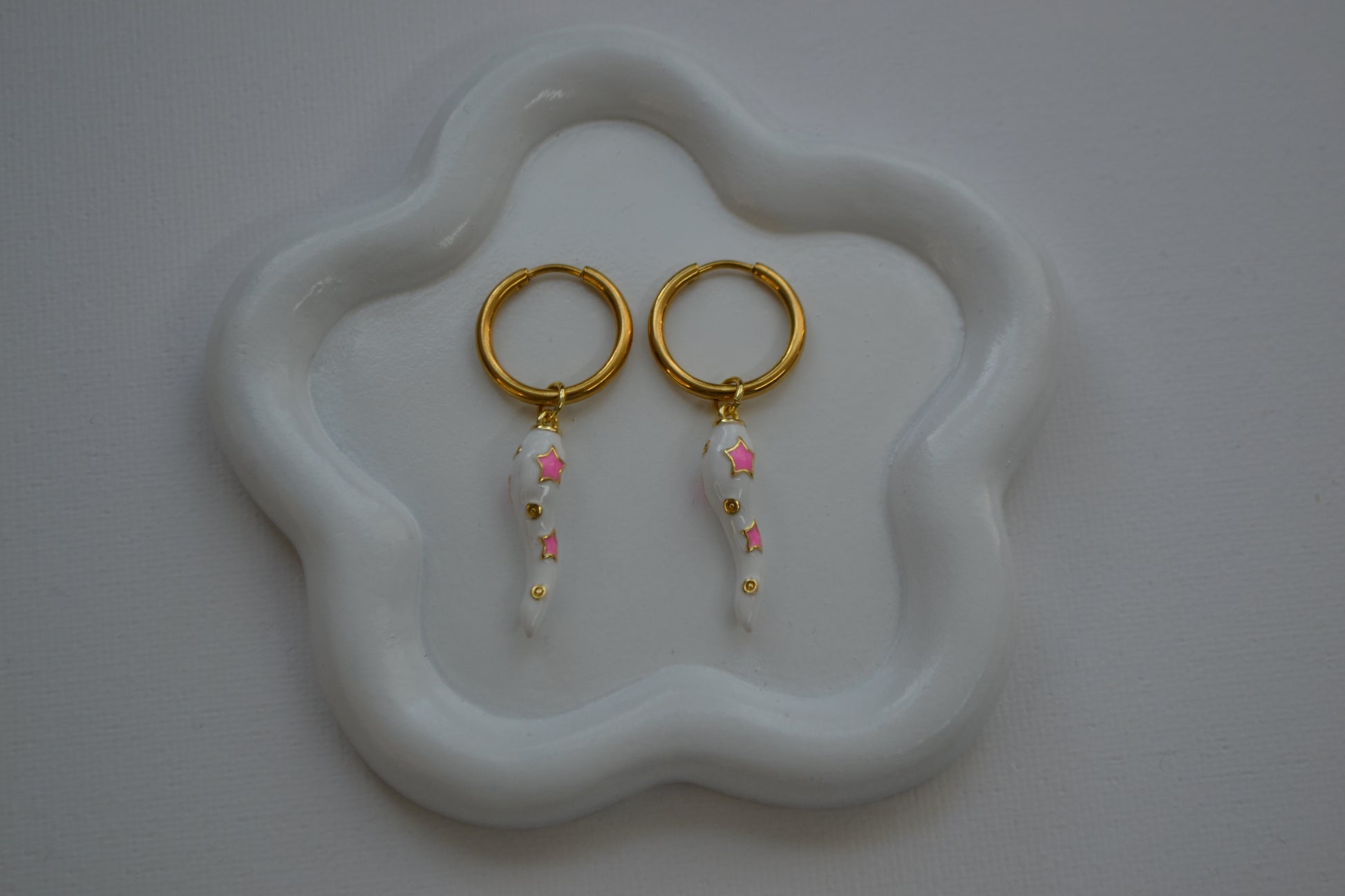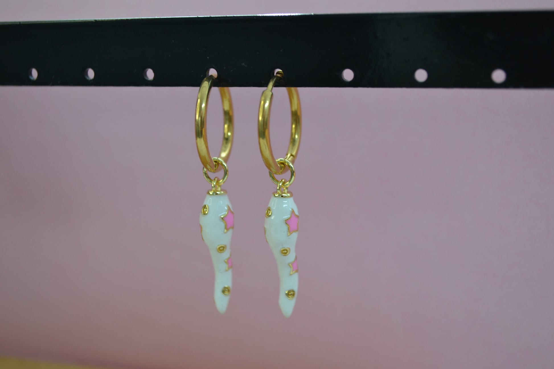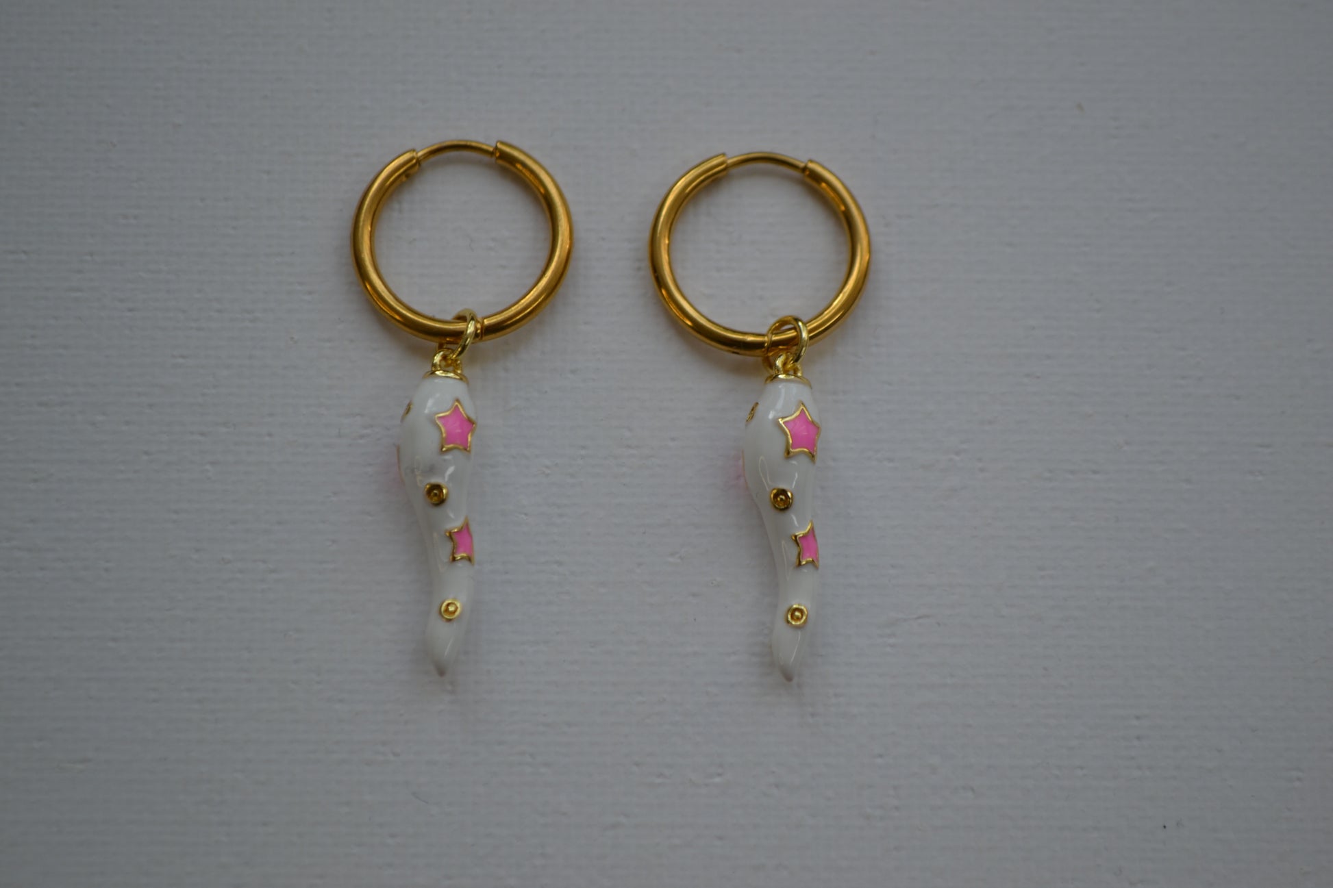 Deze spicy oorbellen voegen een vleugje van goud, wit en roze toe aan je outfit.