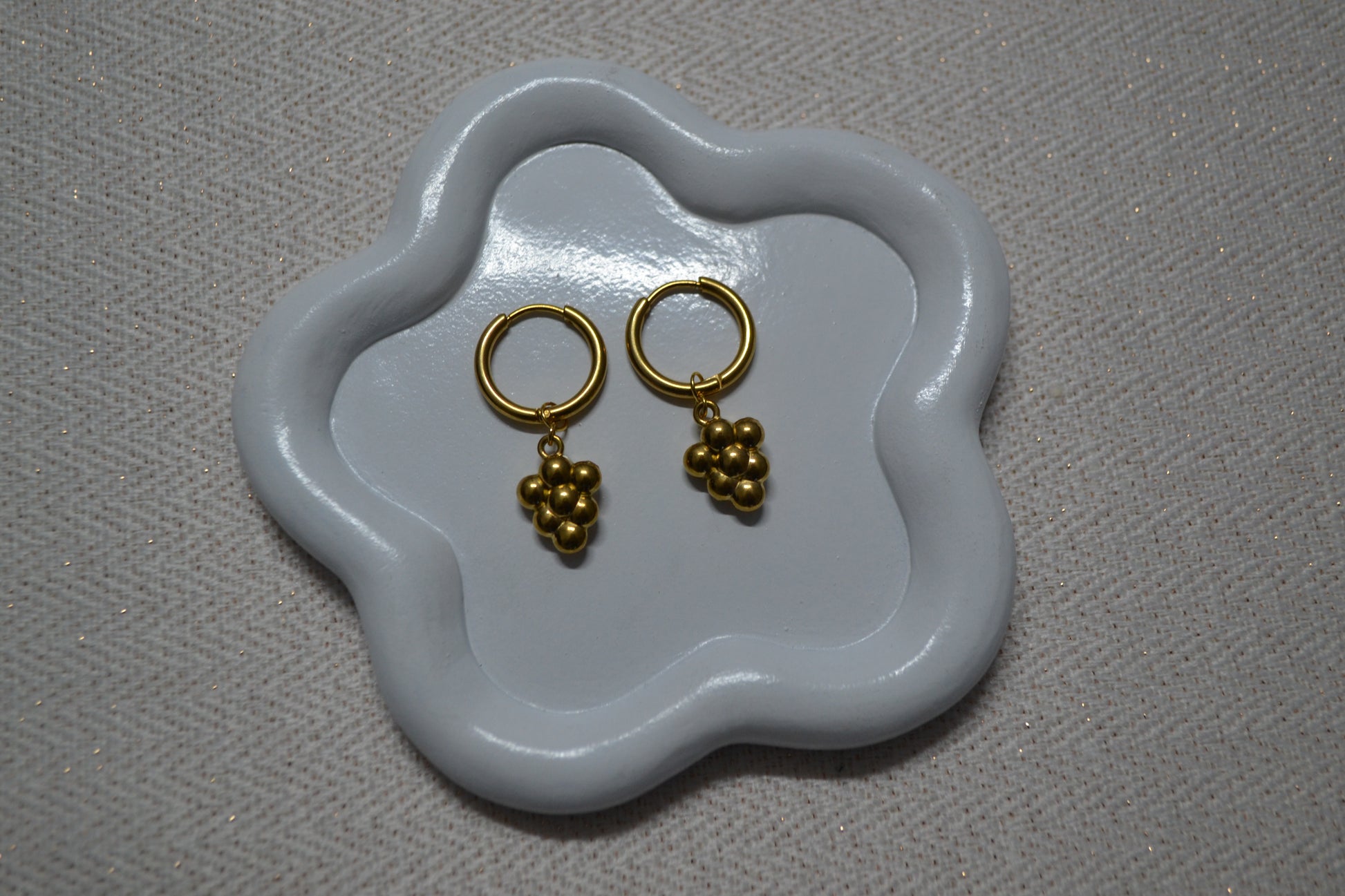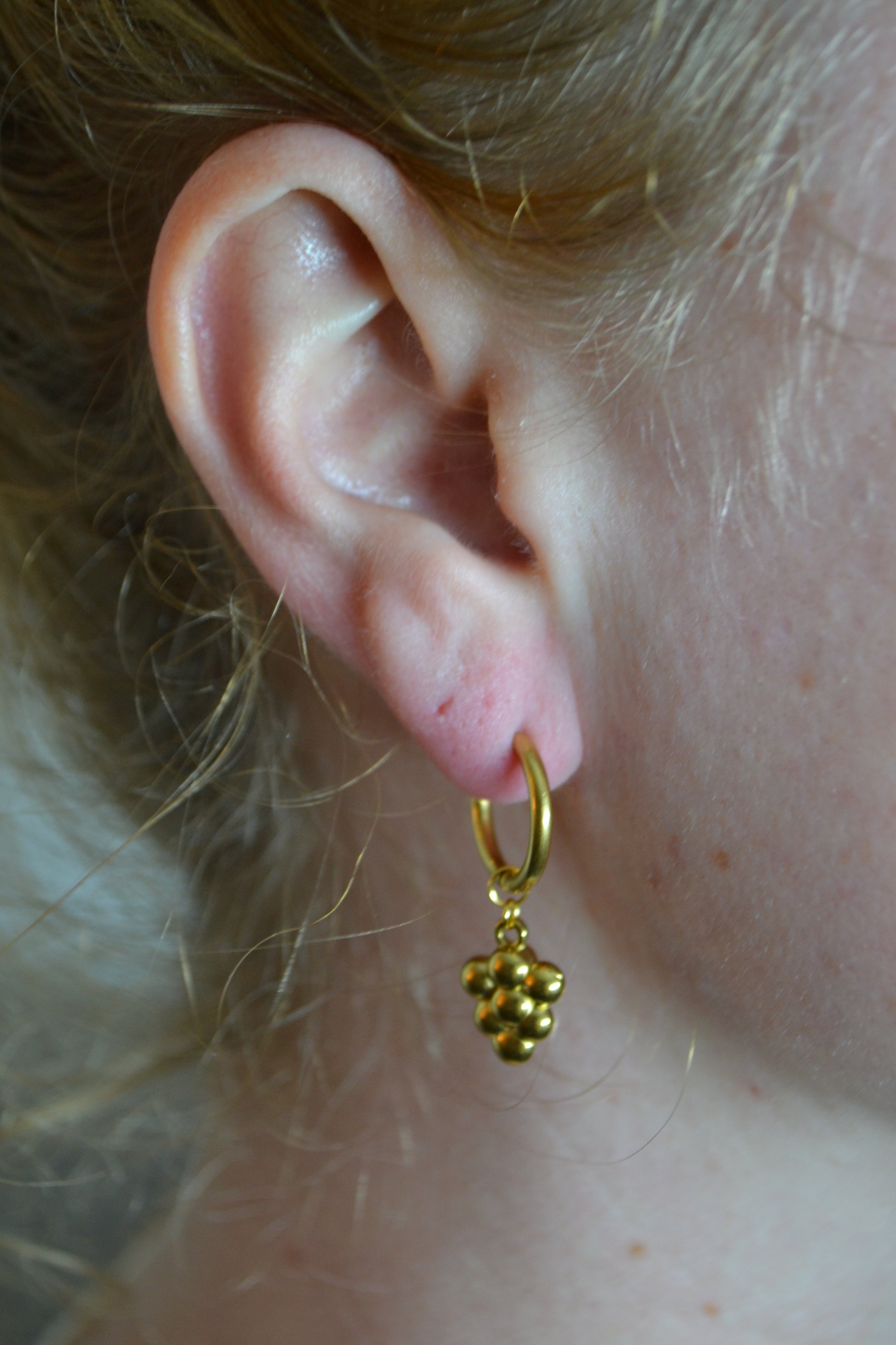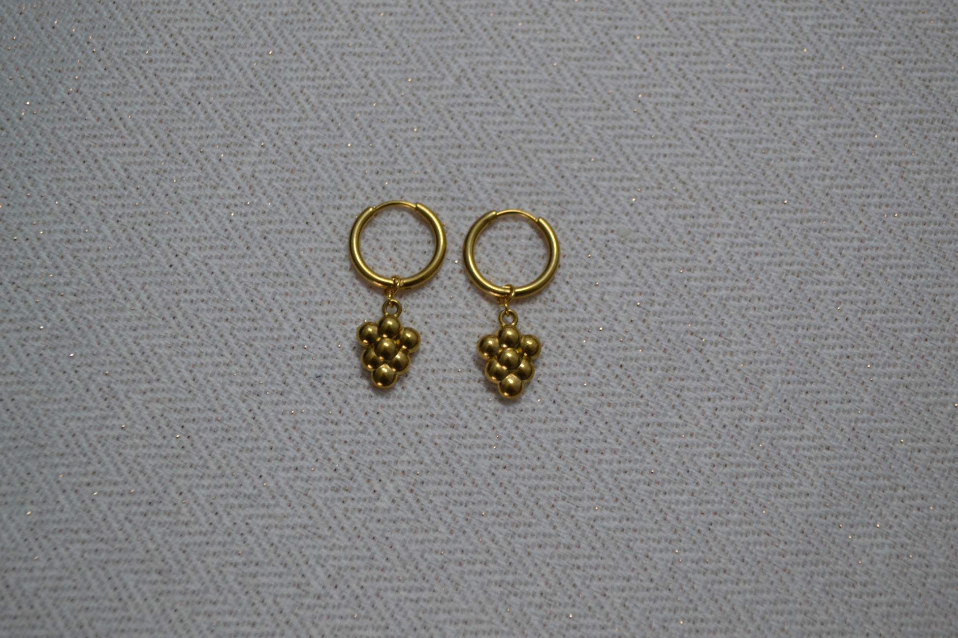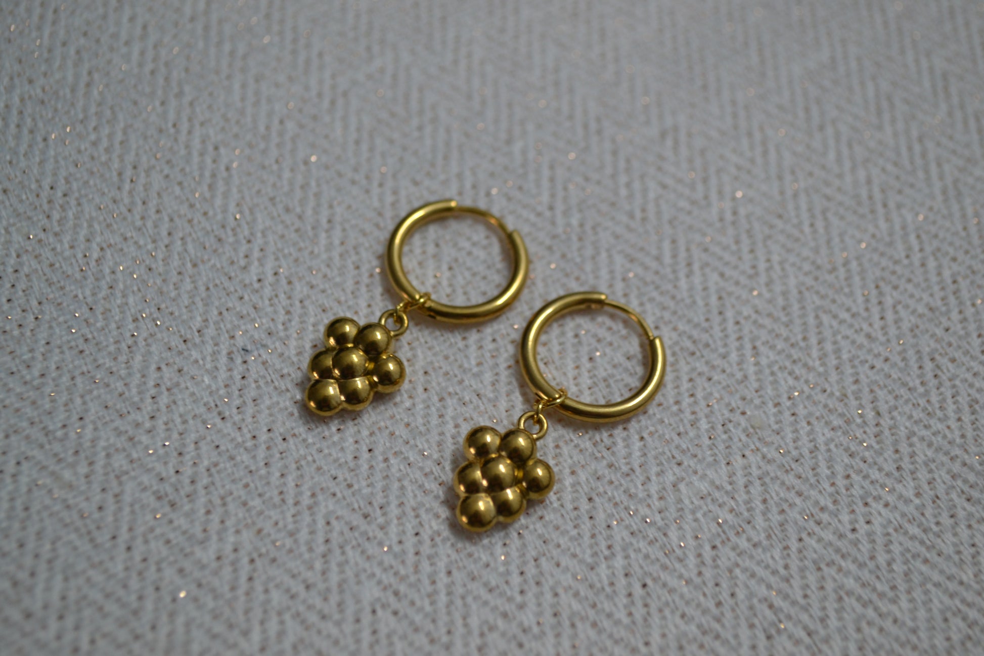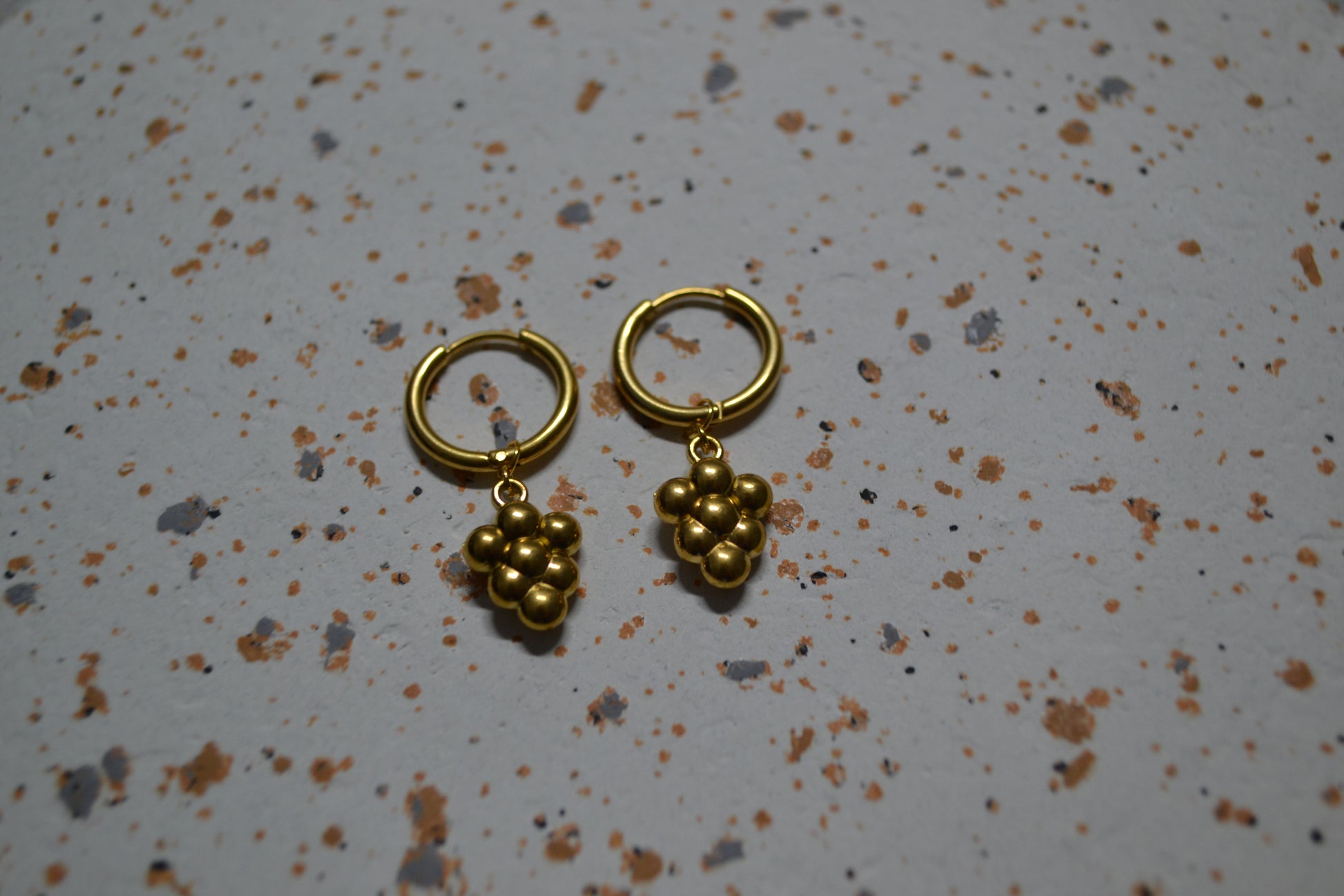 Oorbellen met een goudkleurig druiventrosontwerp die moeiteloos elegantie en creativiteit combineren. Een ideale keuze voor bijzondere gelegenheden.