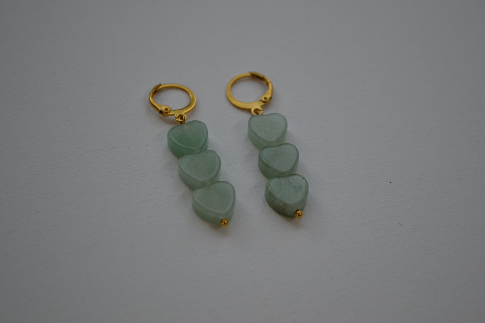 De oorbellen zijn afgewerkt met onderdelen van roestvrij staal. De oorclipjes en de nietstiften zijn van roestvrij staal. De hartjes zijn van natuursteen. De hanger is 3,5 cm lang.